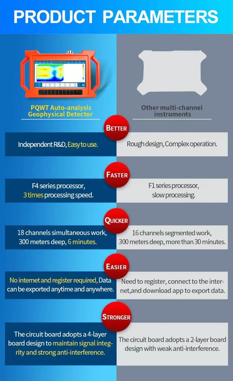 The PQWT-GT Series is the 8th-generation of multi-channel prospecting instrument newly developed by our institute based on the principle of natural electric field frequency selection method. It is widely used in underground water sources, geological structures, mine veins, mine tunnels, cavities, karst caves, ant holes, mined-out areas, dam pipe surge, landslides and other fields.